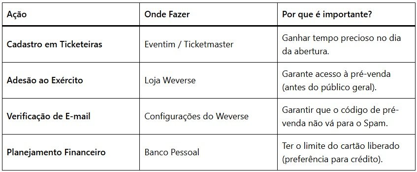 • Site Oficial (ibighit.com/bts): A seção “Tour” do site oficial é o único lugar que listará os links de compra legítimos para cada país.
